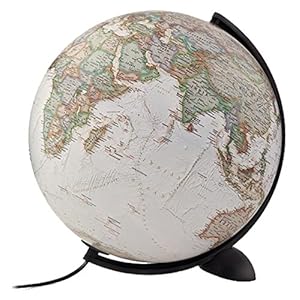 Over 2,000 geographical names are written in this stand-illuminated globe. The text is clear and every country represented in a different color, with a darker shade at the